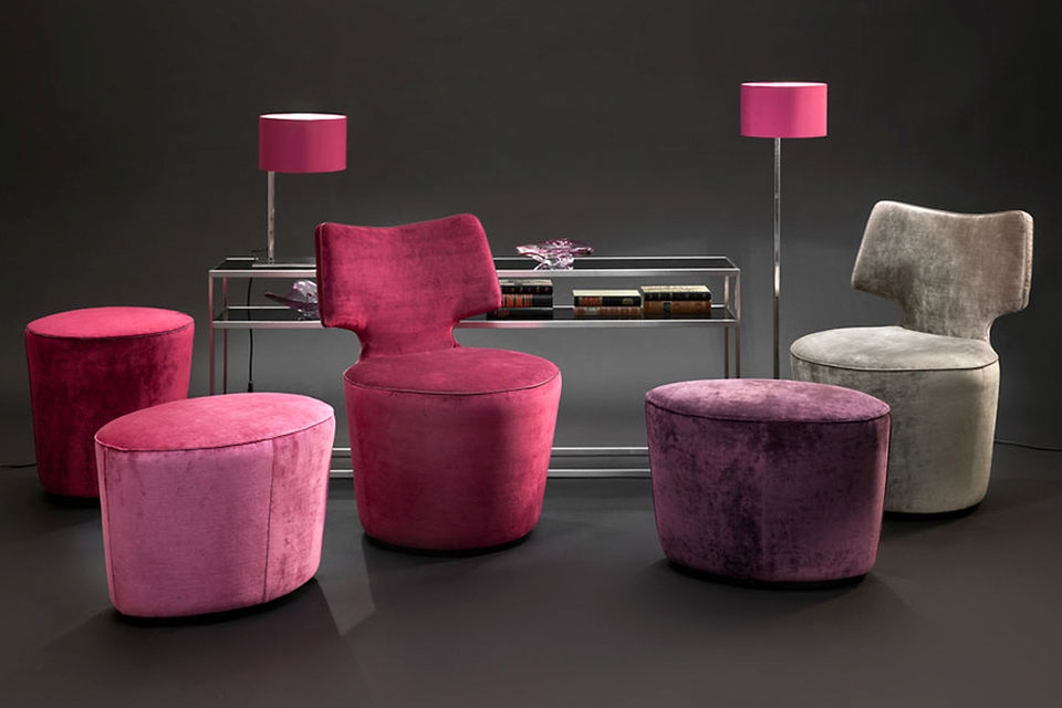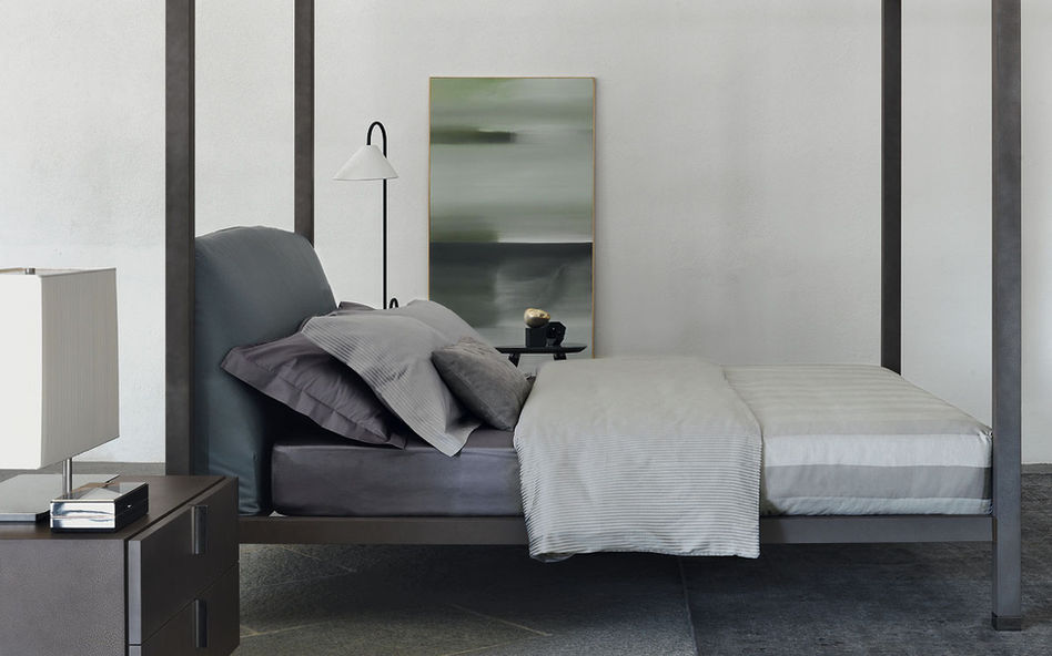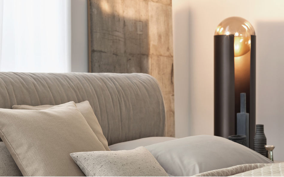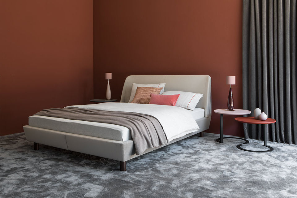 Sofa Biss, DesignPinuccio Borgonovo, mit Bezug Velluto 724, komplett mit Rückenlehne, gepolstertem Sitzbezug, Stütz- und Deko-Kissen. Nachttisch Iko, Design Rodolfo Dordoni.